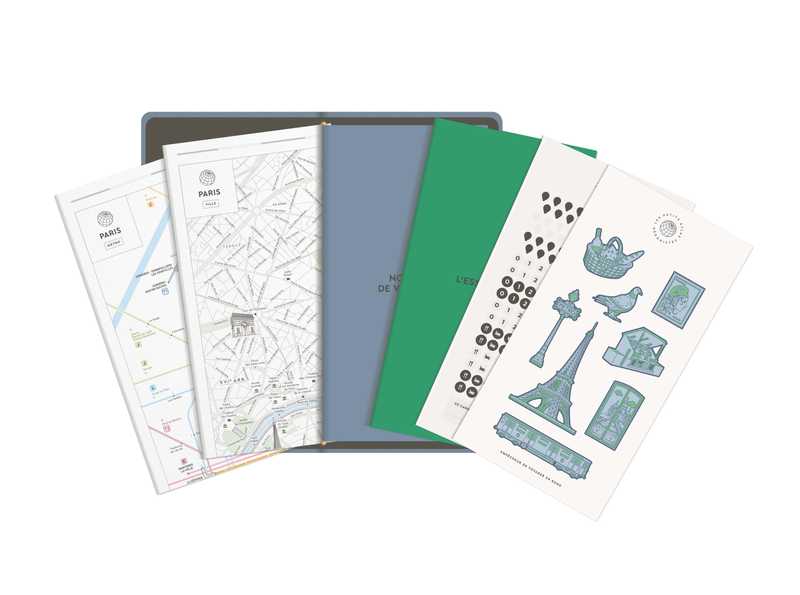 Ce carnet contient : une pochette à rabats, une carte de la ville, un plan du métro, un carnet d’essentiels de 16 pages, un carnet de notes uni de 64 pages, une pllanche de stickers utiles, une planche de stickers décoratifs.